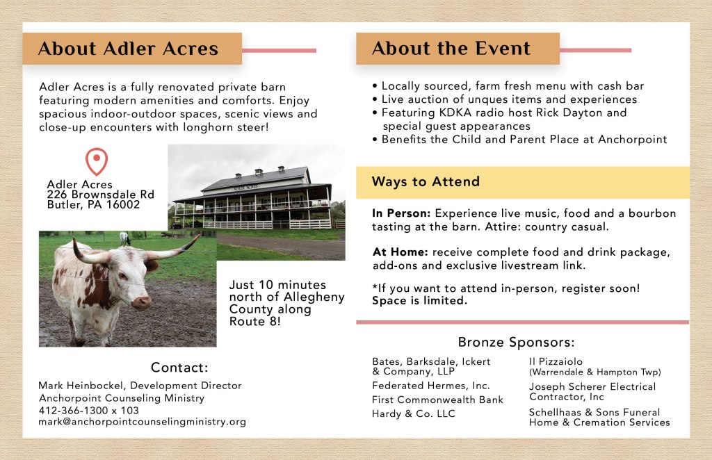 Fundraising events are critical to Anchorpoint Counseling’s success, as they thank generous donors and supporters, showcase their impact and raise awareness for mental health issues that are still existing in the community. Below is a series of digital and print collateral I created to provide information and grow excitement for 2021’s series of events. The pieces range from early stages of event production, to invitations and sponsor packets.